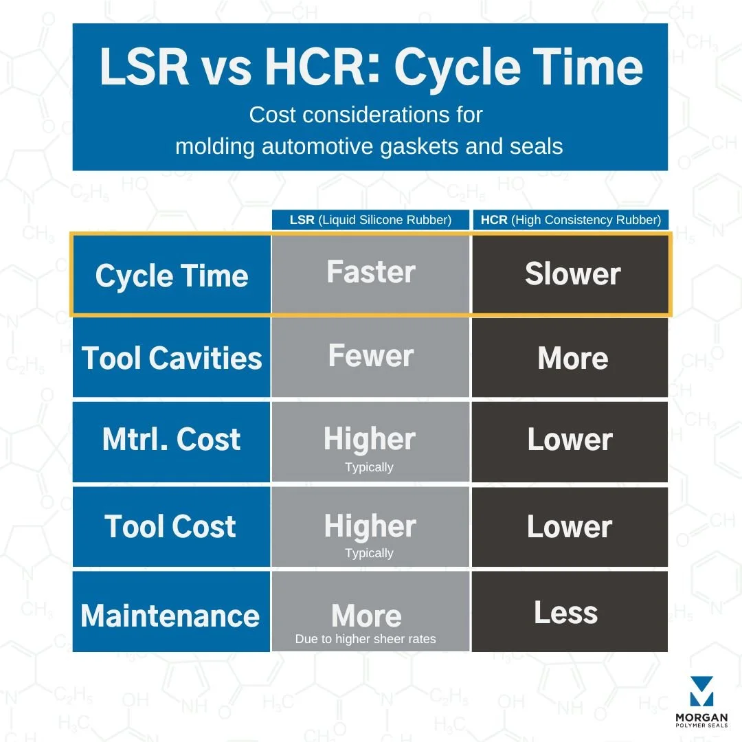 As part of our ongoing series of articles about molding automotive gaskets with Liquid Silicone Rubber (LSR) versus molding with High Consistency Rubber (HCR), this article will explore the difference in cycle times between the two materials. Liquid Silicone Rubber generally has faster cycle times in molding processes than High-Consistency Rubber - primarily because of the differences in their material properties and the molding techniques used.