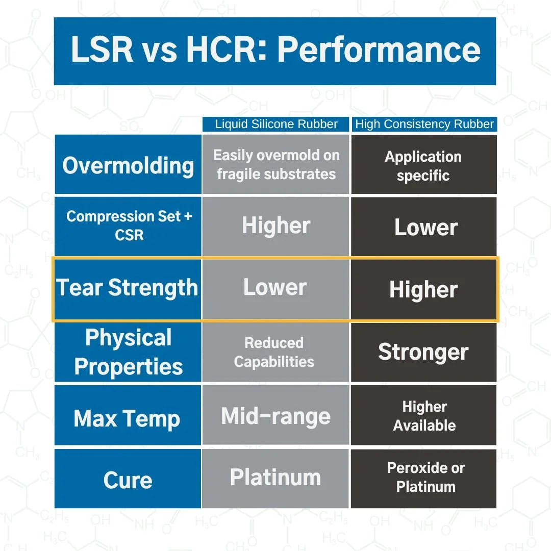The choice between LSR and HCR silicone for automotive gasket manufacturing will depend on the specific requirements, such as the need for intricate design and environmental resilience (favoring LSR) versus the need for high mechanical durability and tear resistance (favoring HCR).